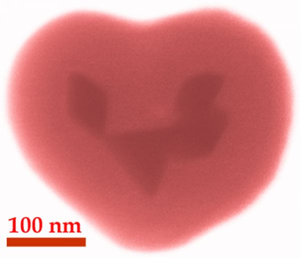 Реальное изображение просвечивающей электронной микроскопии. Не совсем артефакт, но редкий гетеродимер, в котором диоксид кремния покрывает сразу несколько серебряных частиц: декаэдров и, наиболее вероятно, тетраэдр.
