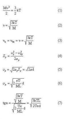 Введём систему координат xOy так, как показано на рисунке. Угол α можно найти из равенства tg(a)=vx/vy, где vx и vy – проекции скорости иона на координатные оси в момент попадания на подложку. Очевидно, что если модуль начальной скорости задан, то на максимальный угол α от вертикального направления отклонятся ионы, начальная скорость которых направлена горизонтально. Поэтому будем рассматривать именно такие ионы. Начальная скорость ионов равна (для оценки) среднеквадратичной скорости их движения, которую можно выразить из уравнения (1), где M – масса иона, T – температура в кельвинах. Имеем: (2)